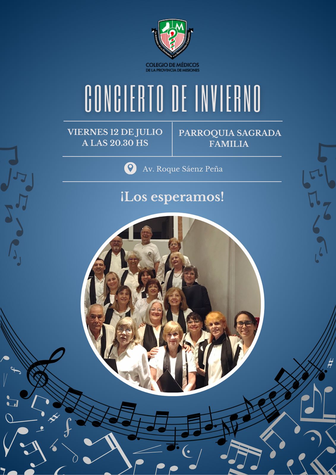 El Coro del Colegio de Médicos de la provincia de Misiones invita al “Concierto de Invierno” que llevará a cabo el próximo viernes 12 de Julio a las 20:30hs. en la Parroquia Sagrada Familia, ubicada en la avenida Roque Sáenz Peña 2367 de Posadas.