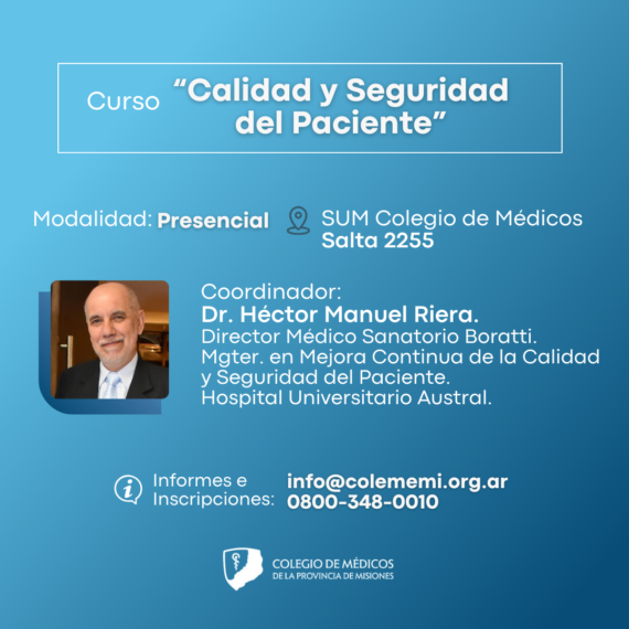 Desde el Colegio de Médicos invitamos al Curso “Calidad y Seguridad del Paciente”. El mismo iniciará, el jueves 26 de septiembre en el aula magna de la Sede del Colegio, calle Salta 2255.