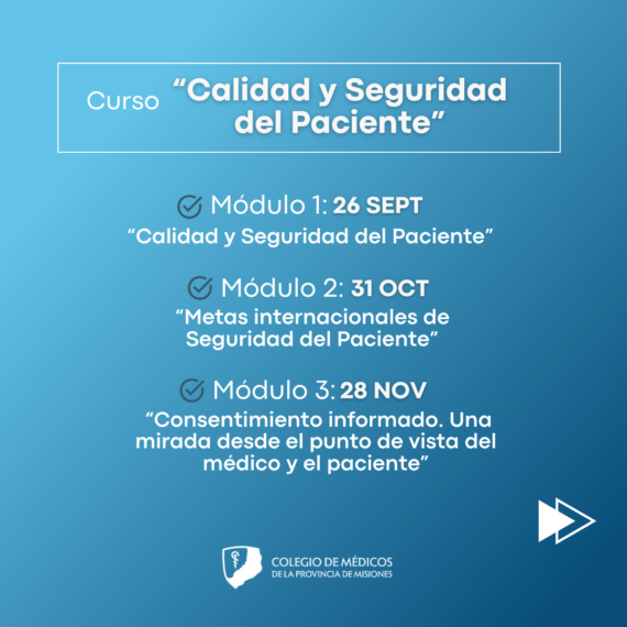 Desde el Colegio de Médicos invitamos al Curso “Calidad y Seguridad del Paciente”. El mismo iniciará, el jueves 26 de septiembre en el aula magna de la Sede del Colegio, calle Salta 2255.